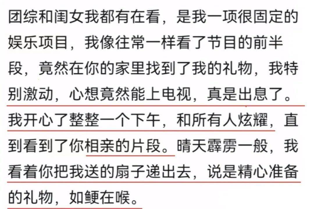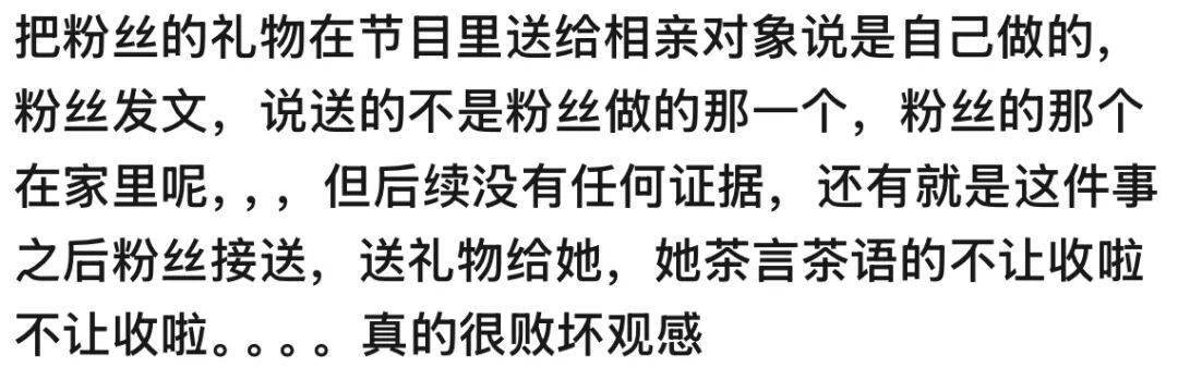因为在节目里将粉丝送的礼物送给了第一次见面的相亲对象,