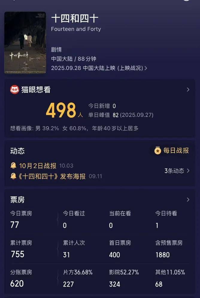 不过,这些大片哪怕是扑街了,也都是轰轰烈烈,伴随着口碑和争议的,但是有一部电影,扑街了都是悄无声息的,那就是电影《十四和四十》。