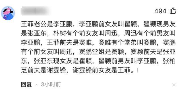 王菲前夫是李亚鹏,李亚鹏前女友是瞿颖,瞿颖现男友是张亚东,朴树前女友是周迅,周迅前男友是李亚鹏,王菲前夫还有窦唯,窦唯堂弟是窦鹏,窦鹏前女友是周迅,窦鹏堂姐窦颖的前夫又是张亚东,张柏芝前夫是谢霆锋,谢霆锋前女友还是王菲。