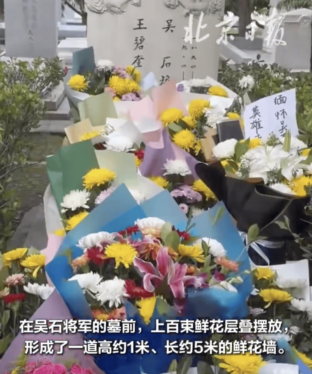 Hundreds of bouquets now form a wall of flowers in front of Wu Shi’s tomb, many inscribed with messages such as "Remember Wu Shi, Hero Forever." A park staff member said visitors have been arriving continuously since early morning — far more than usual outside the Qingming Festival period.