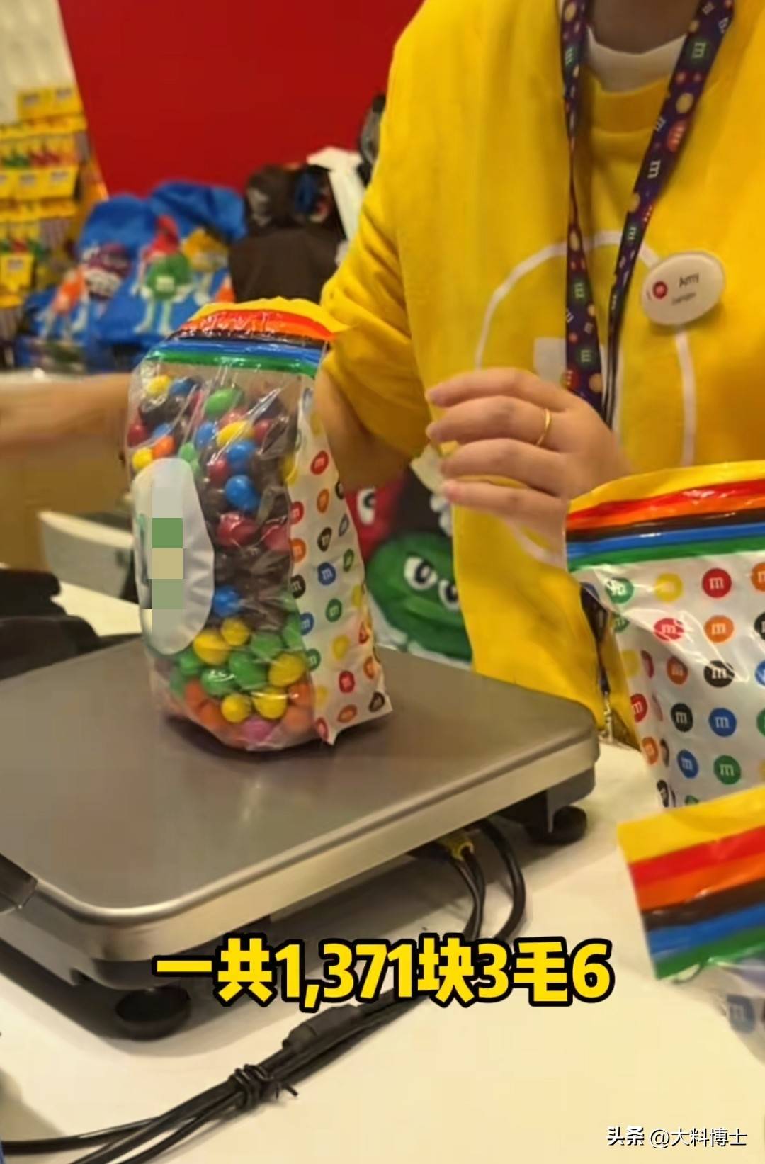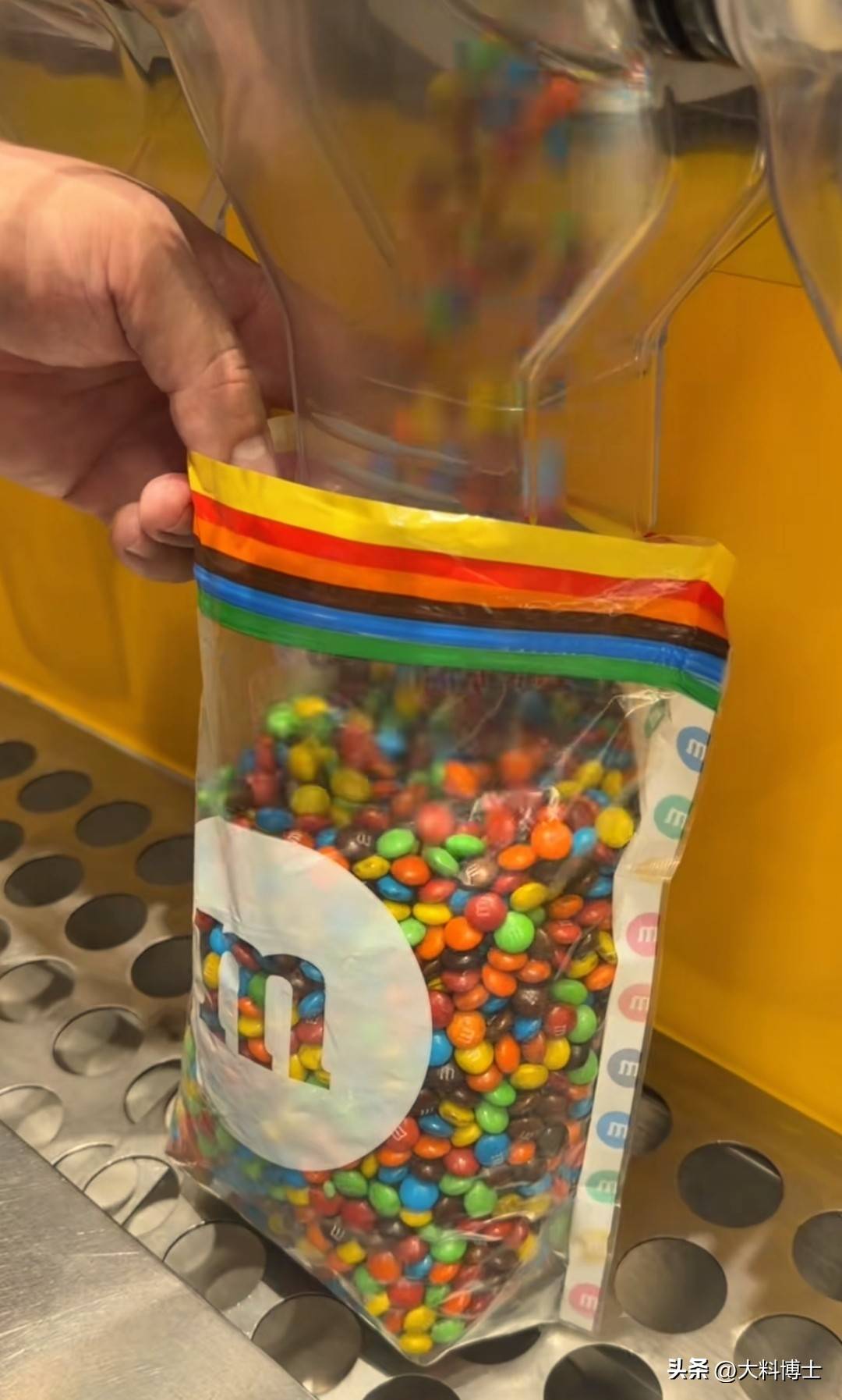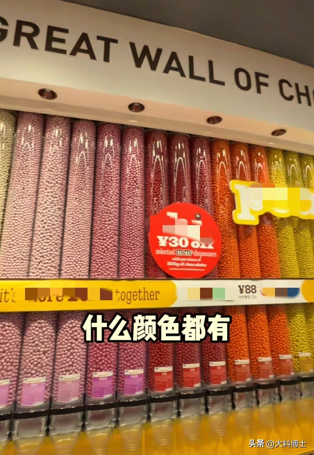 选购巧克力豆的方式也很特别,巧克力豆都装在一根一根的透明柱子里,柱子下面有闸门,想买什么颜色口味的,需要顾客自己拿着袋子拉开闸门自己接。
