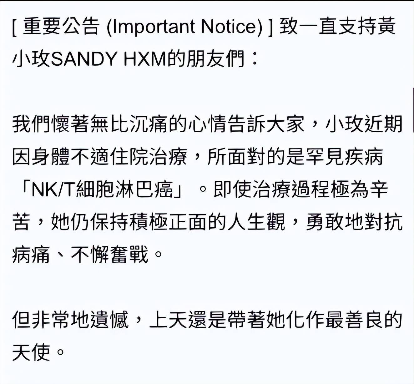 2025年10月15日,黄小玫因罕见疾病 “NK/T细胞淋巴瘤”(非霍奇金淋巴瘤高度恶性亚型)去世,年仅34岁。她生前以创作歌手、音乐制作人及影像创作者身份活跃于艺坛,她的离世引发广泛悼念与思考。