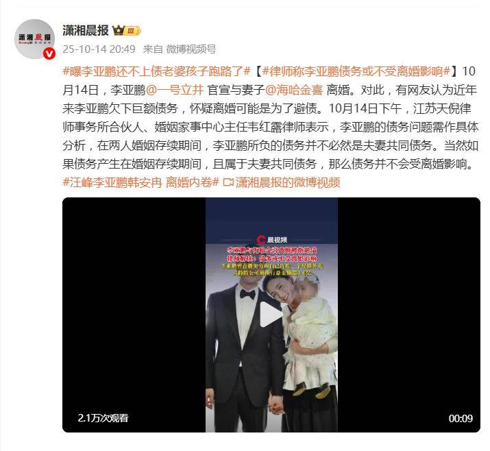 然而,网友的质疑并未就此打住。此前不少人猜测离婚是否为了“避债”,律师对此指出关键所在:若债务属李亚鹏个人经营债务且未用于家庭共同生活,离婚不影响其个人承担责任;但若属夫妻共同债务,即便离婚两人仍需共同承担。目前双方未公开债务细节,让这场“离婚是否关联债务”的罗生门持续悬置。