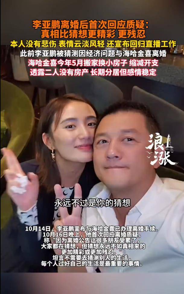 一纸离婚公告炸出全网猜想后,李亚鹏终于亲自下场回应了。10月16日晚,他直面镜头,以一句“猜想永远不如真相来得更加精彩或更加残忍”轻描淡写地带过所有猜测,呼吁大家“不必过度解读他人生活,每个人过好自己的生活最重要”。视频中的他表情风轻云淡,语气平静豁达,丝毫未见婚变阴霾。