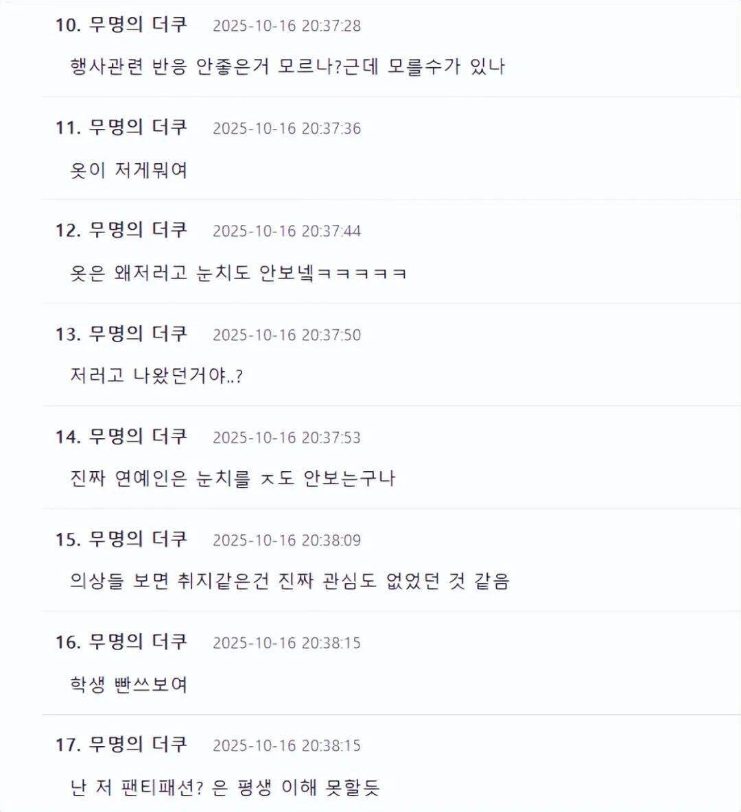 这下韩国网友可不买账了。从“这打扮算什么?”到“内衣外露到底什么审美”,批评声几乎淹没了评论区。有人犀利吐槽:“她难道不知道现在全网都在骂这个派对吗?居然还敢发这种照片?”更有人直指她“内裤都露出来了”“根本没把活动宗旨放在眼里”,质疑在公益场合刻意突出性感是否恰当。