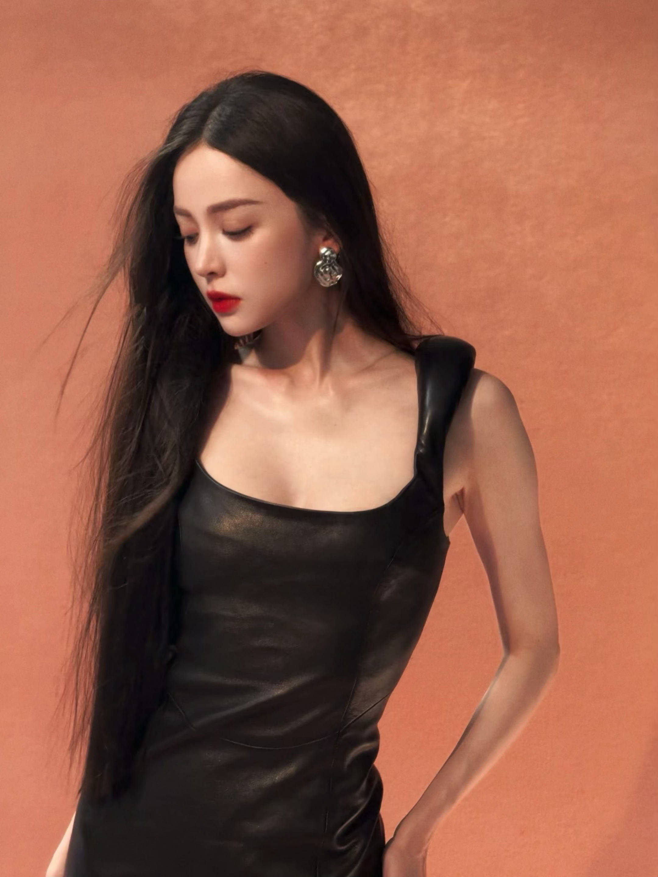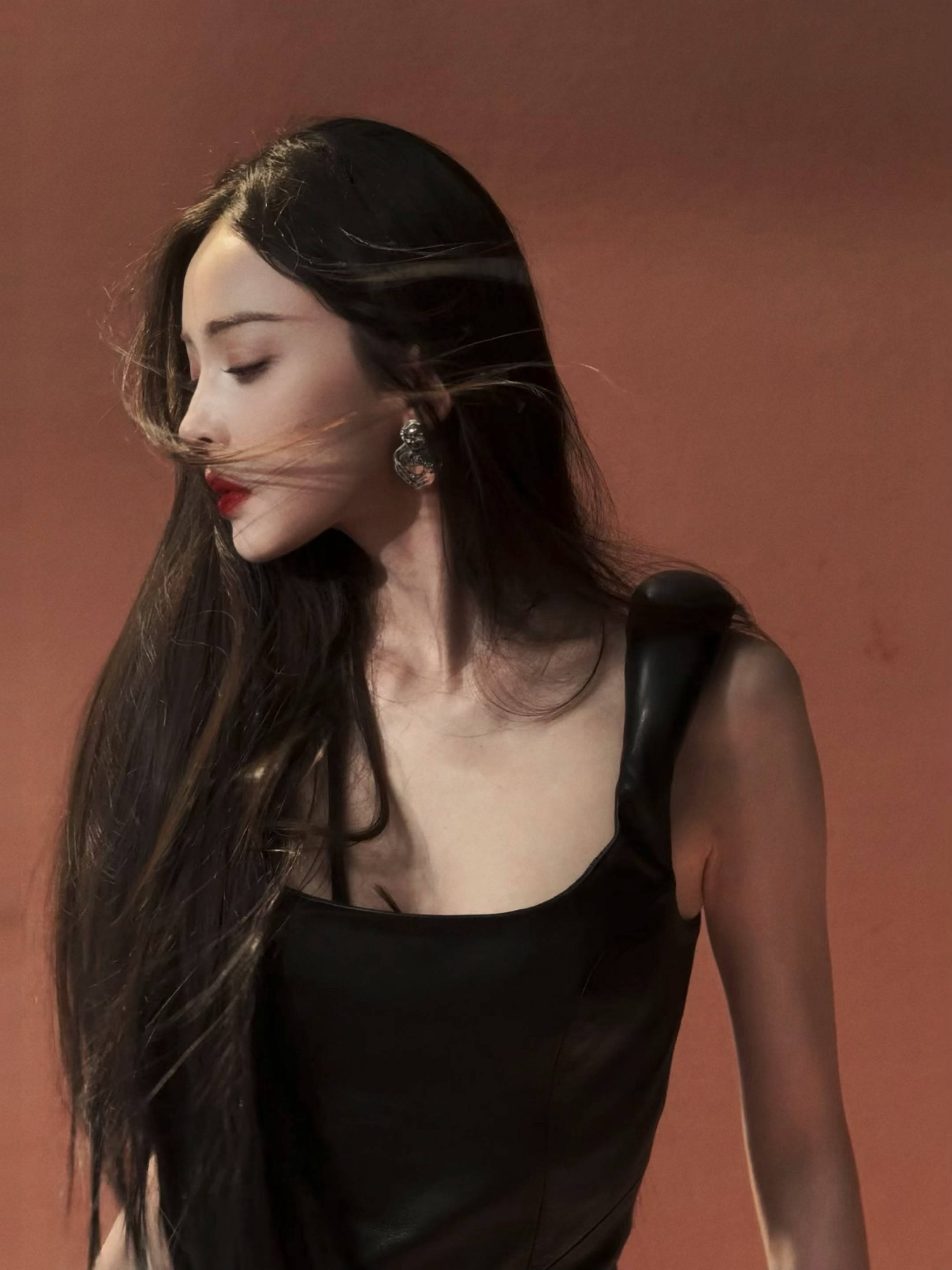 古力娜扎穿黑色吊带裙,胳膊纤细。