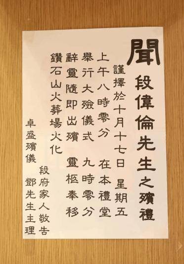 前亚视小生段伟伦8月底因肾衰竭离世,享年67岁。16日在红磡万国殡仪馆设灵,昨日出殡,灵柩将移往钻石山火葬场火化。