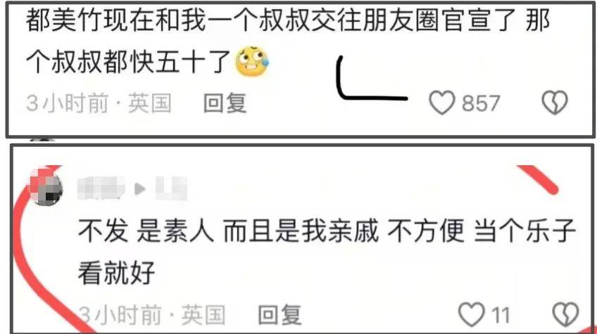 曝光男方朋友圈的正是男方亲戚,管男方叫叔叔,叔叔本人还在朋友圈回复了,大方承认秀恩爱对象就是都美竹。