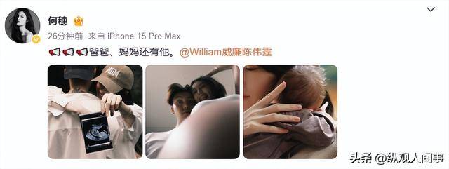 今天上午10点,陈伟霆和何穗突然同步更新微博,晒出三张照片配文“爸爸、妈妈还有他”。