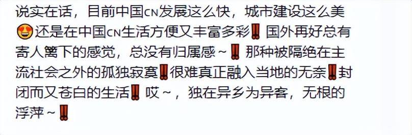 还有人觉得她这话说得太对了,现在国内发展多好,城市又漂亮,生活多方便。在国外待着,就算条件再好,也总感觉自己是个外人,融不进人家的圈子。