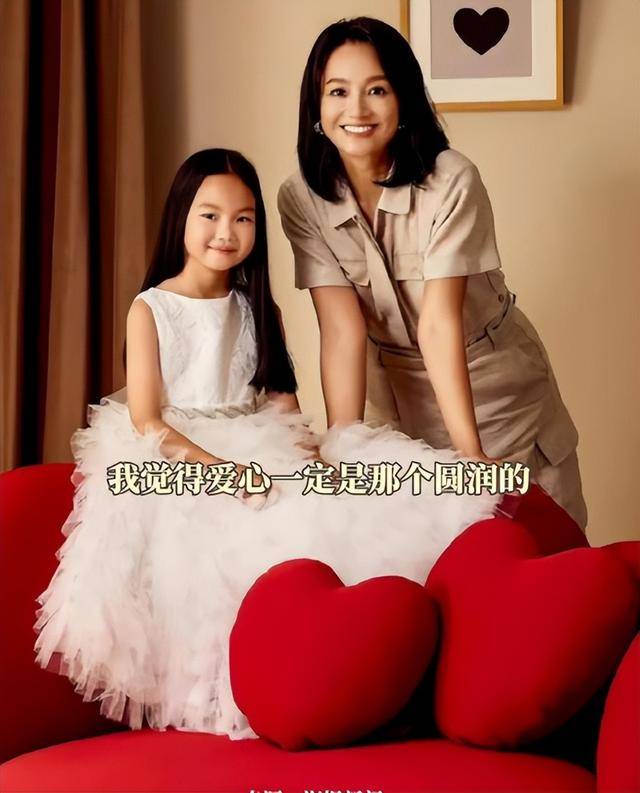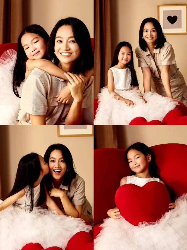 照片里,朱丹和女儿坐在一张大红沙发上,小小丹面对镜头一点不怯场,表情自然又自信。