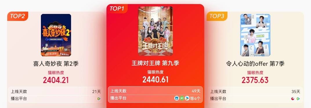 综艺节目的类型繁多,但观众的偏好却始终如一。从播放数据来看,《王牌对王牌9》《喜人奇妙夜2》以及《令人心动的offer 7》稳居热度榜前列。这也说明,与新综艺相比,大家更青睐那些老牌节目。