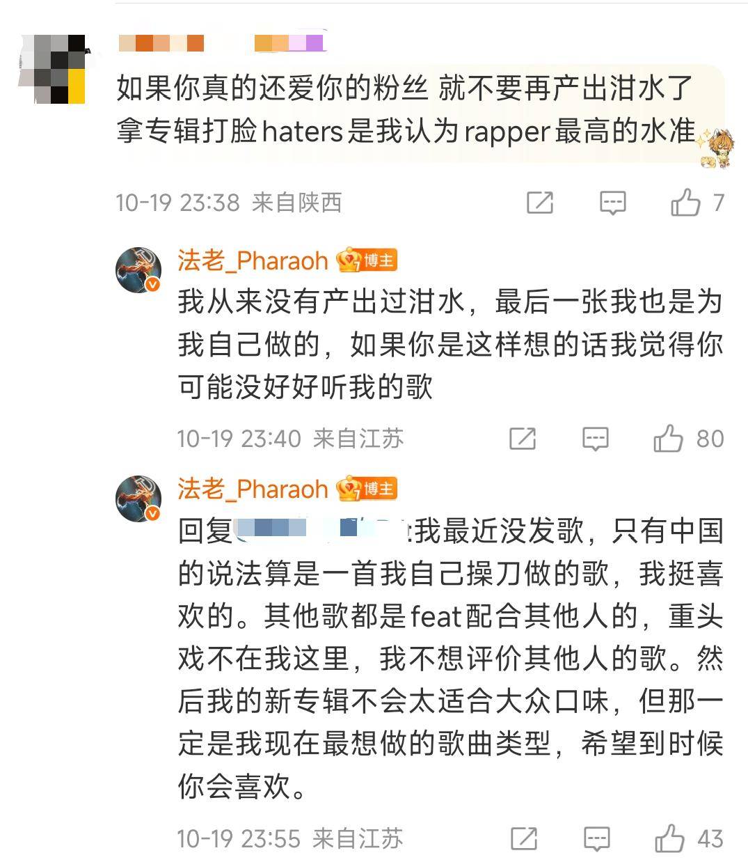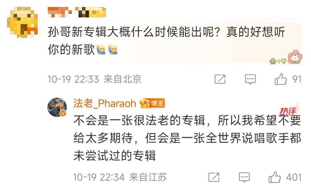 就在昨晚,法老久违地开启了回复评论环节,回复了关于专辑、争议、生活等大量问题。