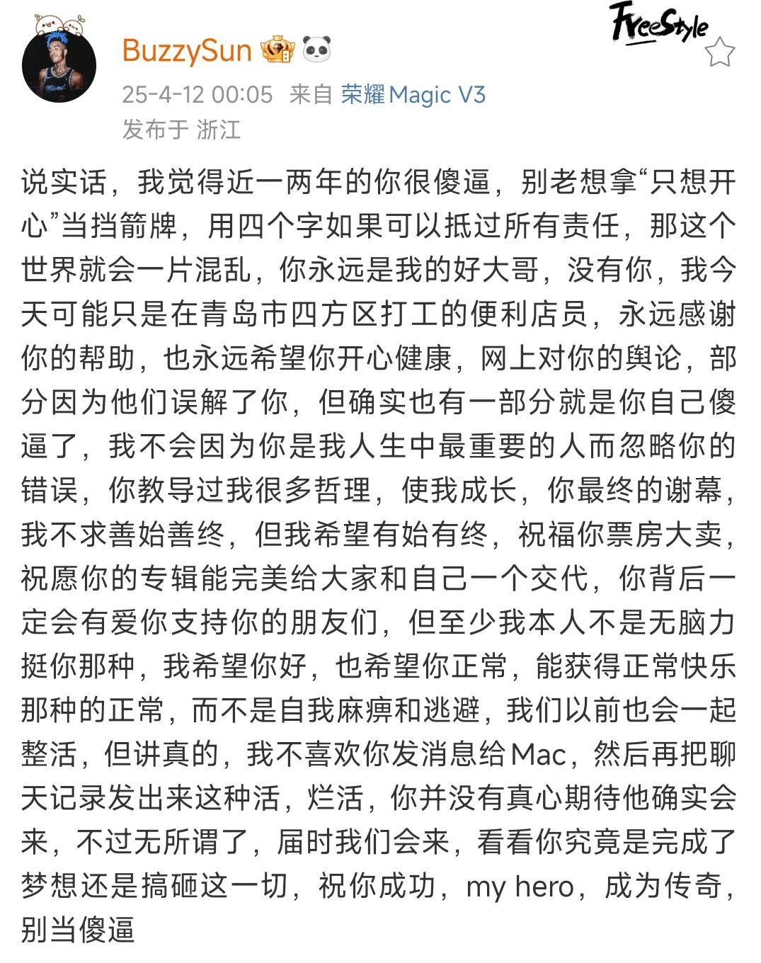 “人格方面有些人谣言说多了就变成真的了,但思想层面我确实变了,有时候觉得hiphop有点容不下我的脑子”