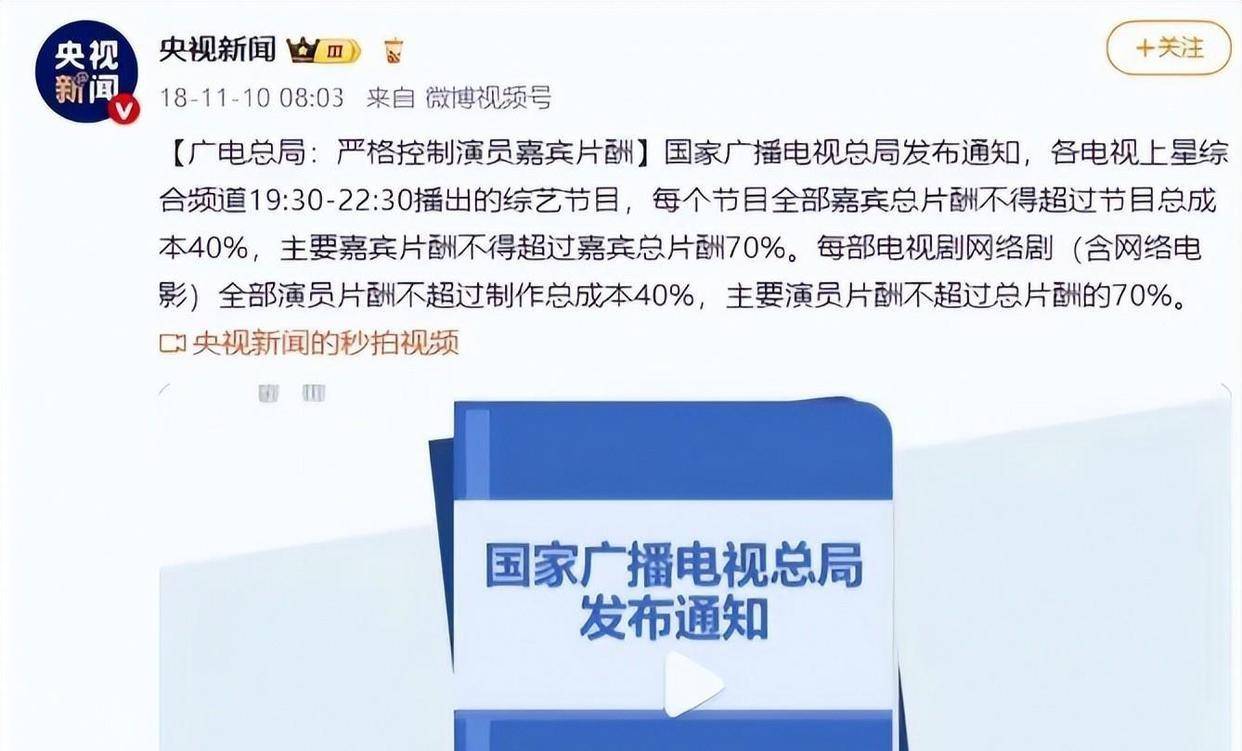 2018年,广电总局出台的限薪令明确指出:主要演员单部剧集片酬不得超过制作总成本的40%,且个人最高片酬限制在5000万元以内。