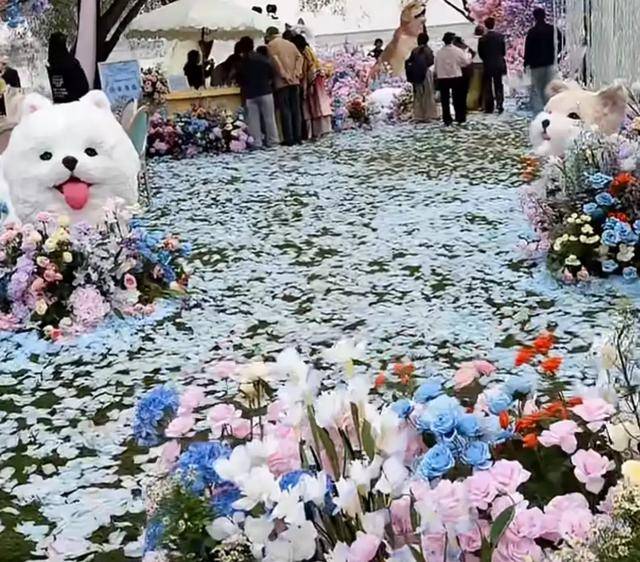 近距离再看,也是各种鲜花摆放在路两边,还有各种大型玩偶,几个大的遮阳伞。