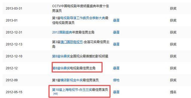 2012年,他不仅提名白玉兰奖最佳男演员,同时还拿到了那年的华鼎奖电视剧最佳男主角、金莲花奖最佳男主角。