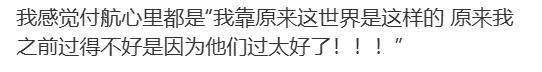 有网友认为,付航的格格不入,是因为他在想:“原来这世界是这样的,原来我之前过得不好是因为他们过得太好了。”