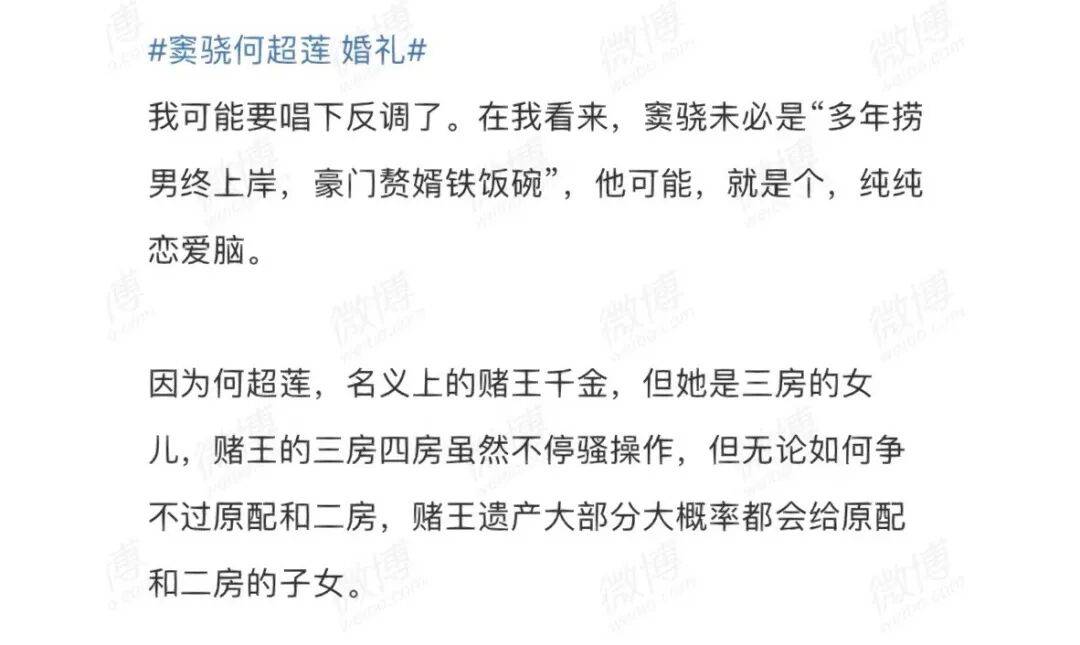 不仅如此,网传何超莲的嫁妆就高达20亿,这不就等于窦骁啥也不干,分得10亿家产嘛!