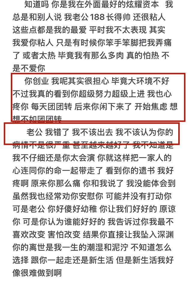 其妻子在悼念长文中说了这样一句话:毕竟大环境不好,不过我真的看到你的超级努力超级上进,我也心疼你,每天团团转,后来你闲下来了,开始焦虑,想想不如团团转。