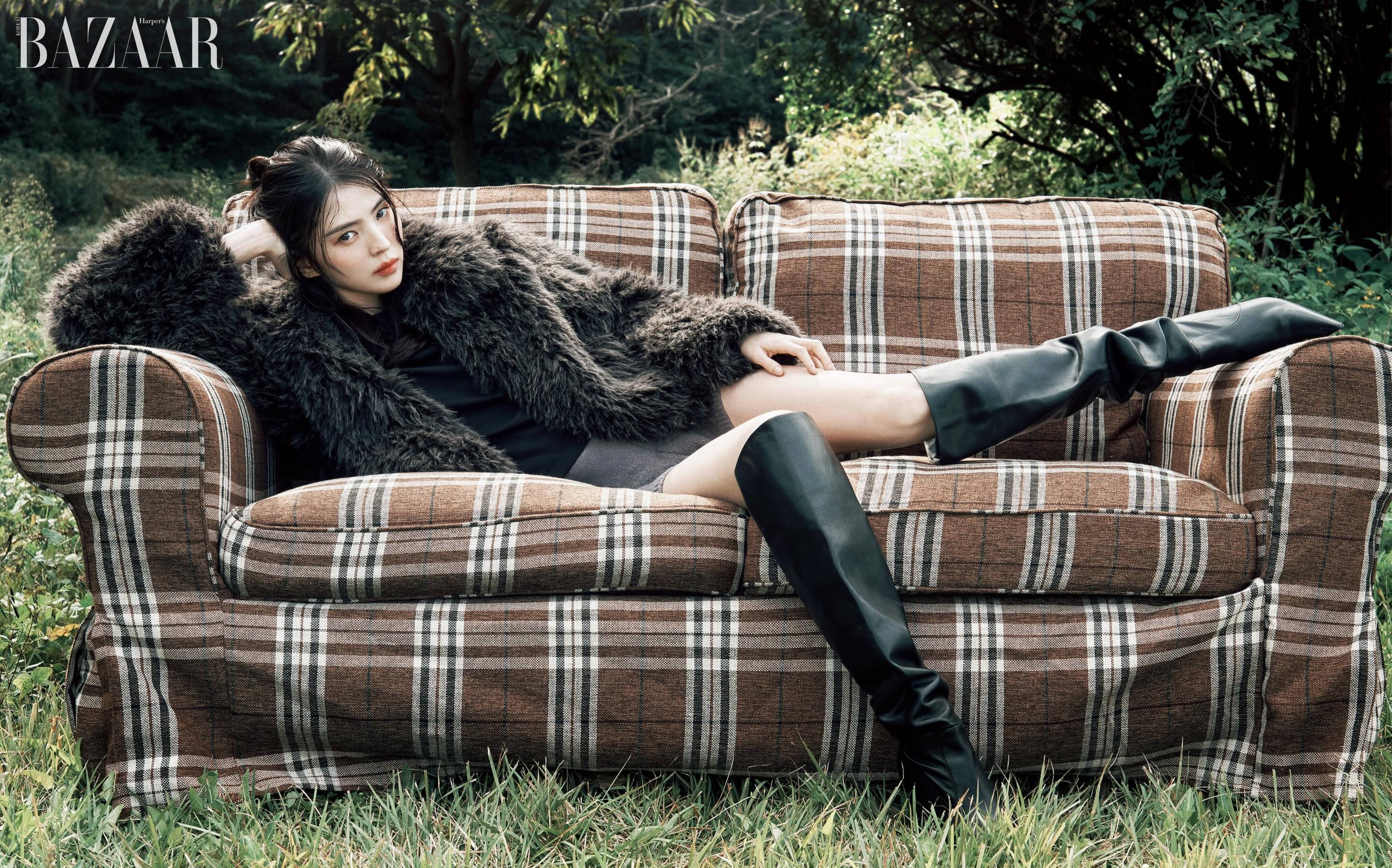 韩素希穿长靴躺在沙发上,长腿吸睛。