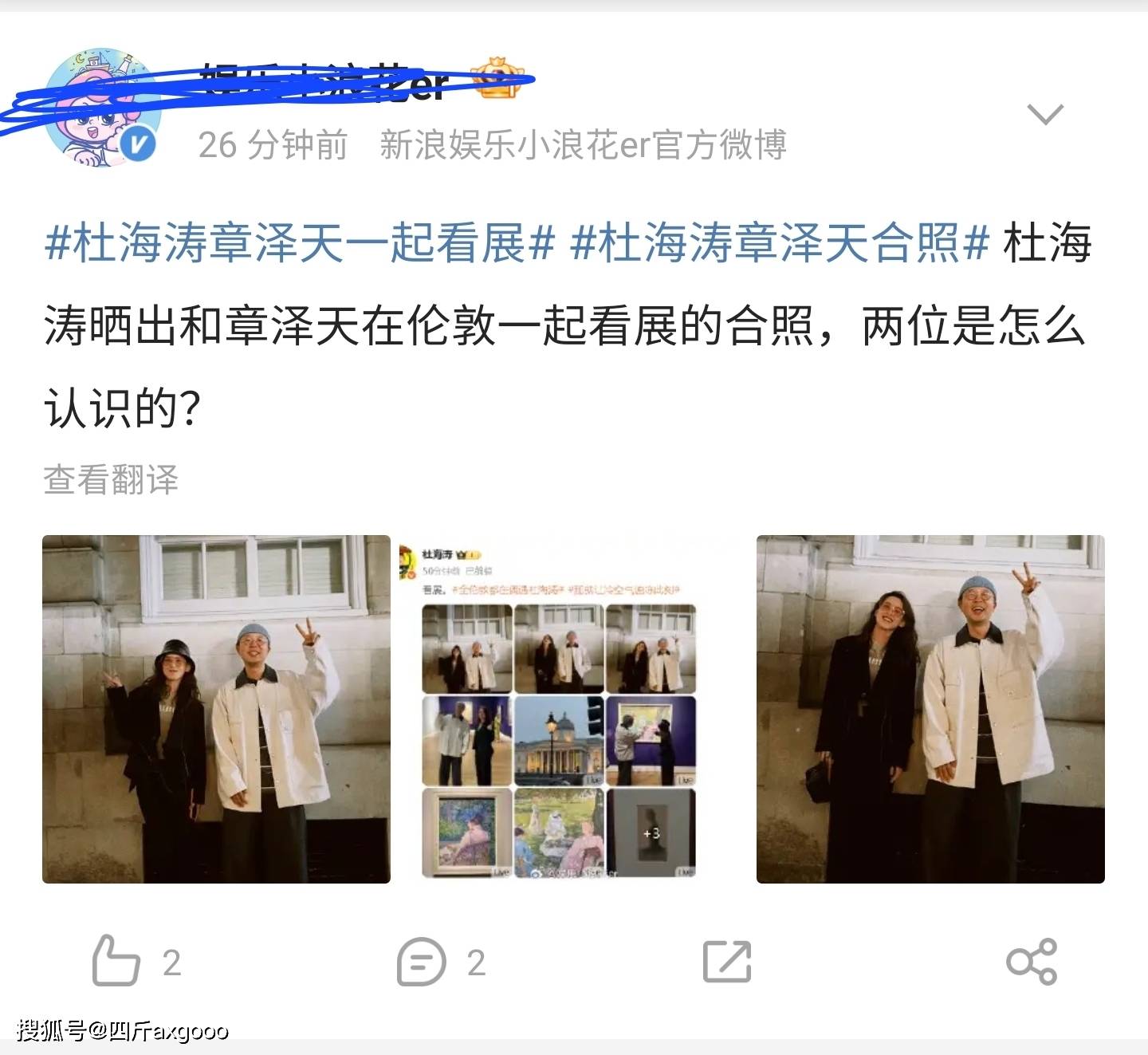 照片里,杜海涛和企业家刘强东的夫人章泽天并肩合影,一起在英国伦敦看艺术展,氛围慵懒惬意。