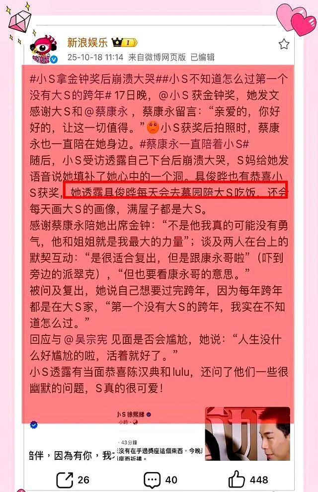 此外,小S还透露自己一直有个心愿,就是帮具俊晔办一场画展,把大S生前喜欢的那种艺术氛围延续下去,让更多人记住她的生活态度。