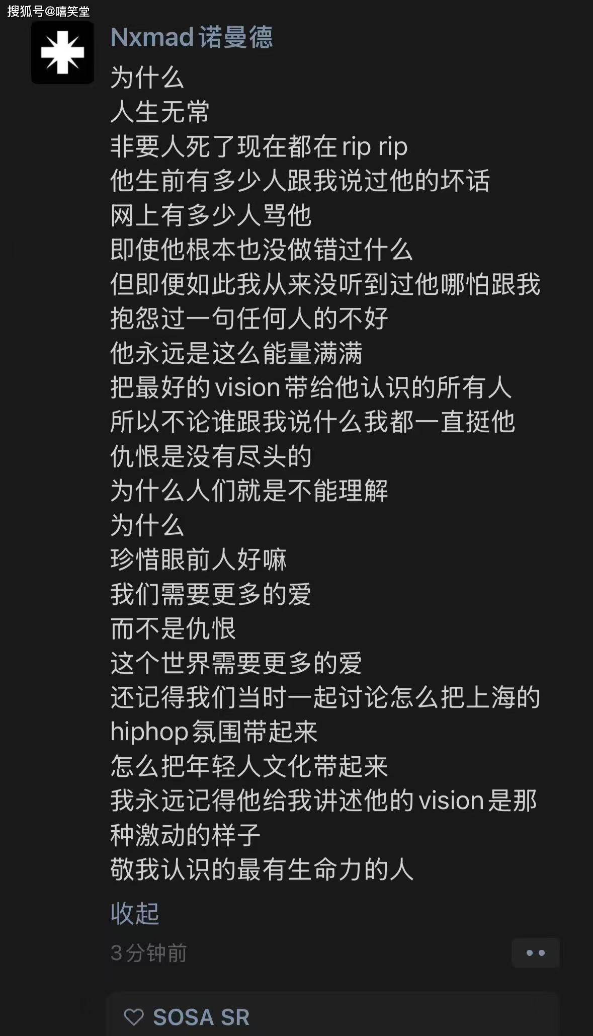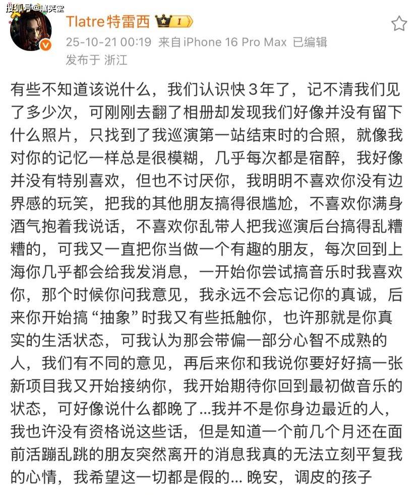 “我开始期待你回到最初做音乐的状态,可好像说什么都晚了…我并不是你身边最近的人,我也许没有资格说这些话,但是知道一个前几个月还在面前活蹦乱跳的朋友突然离开的消息我真的无法立刻平复我的心情,我希望这一切都是假的”