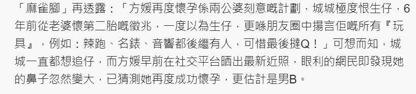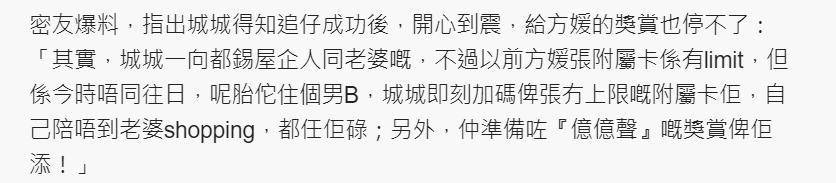 密友更是爆料,这次方媛怀孕,郭富城追子成功开心到发抖,原本他给方媛的附属卡有额度,现在直接换成了无上限的附属卡,随便刷,更是准备了上亿奖励给她。