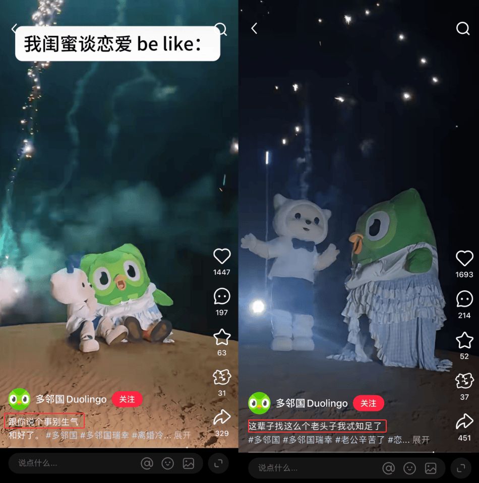 同时,多邻国还模仿《再见爱人》风格,推出了一支《爱是我们学不会的语言》的短片,将他们之间的问题一一展现,甚至发出了灵魂拷问「鸟鹿CP只是童话吗」「当热度褪去,爱的本质是什么」……