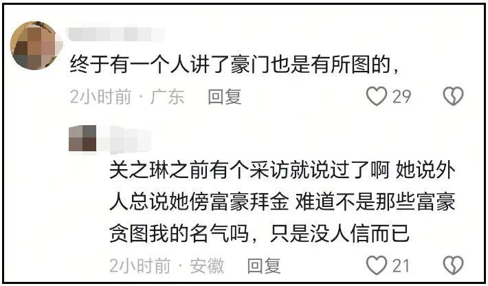 她解释称,很多富二代和明星结婚,就是为了借助对方的名气把自己带入娱乐圈,或者靠对方的热度让自己拥有流量,如此才能更方便创业,把流量最大限度商业化。而何超莲嫁给窦骁,就很符合这样的“套路”,当年关之琳就说过一样的话,都说她贪钱,怎么不能是别人贪她名气呢。