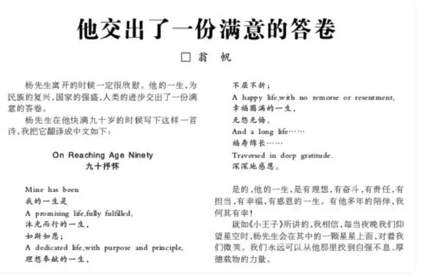她发了一首诗,称是先生快要90岁的时候写的,本来是英文版本的,她翻译出来了。