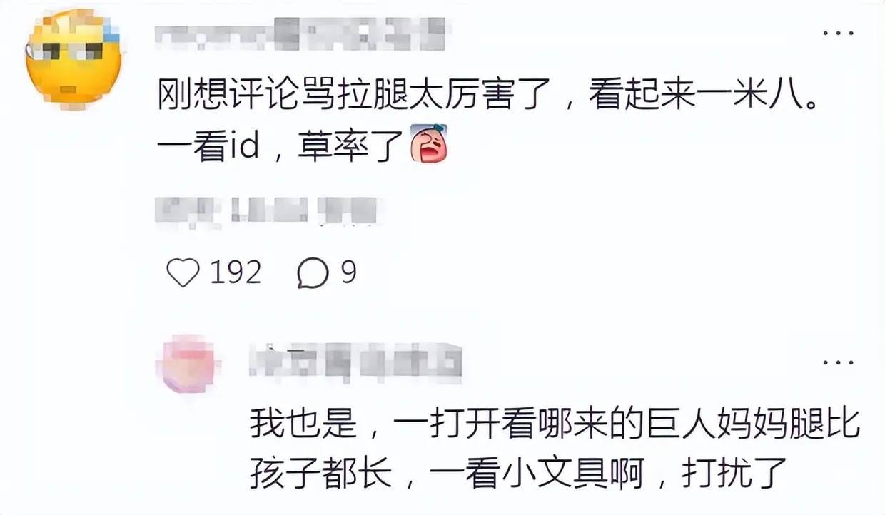 就连网友都惊呆了,一开始以为这人拍照拉腿太厉害了,看起来一米八的样子,这巨人妈妈的腿比孩子都要长。