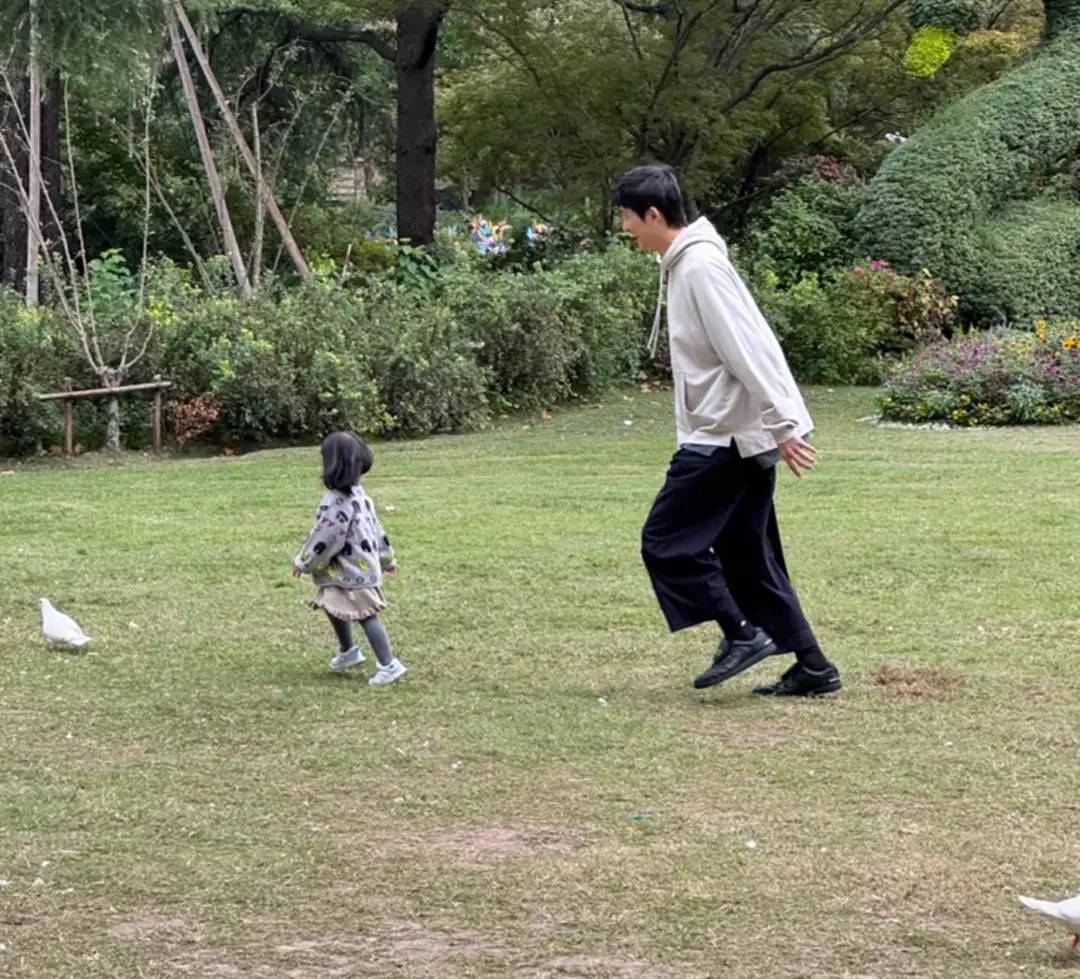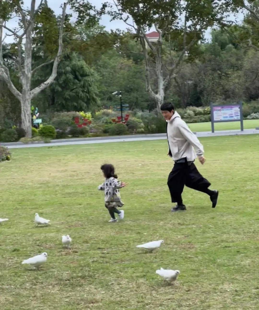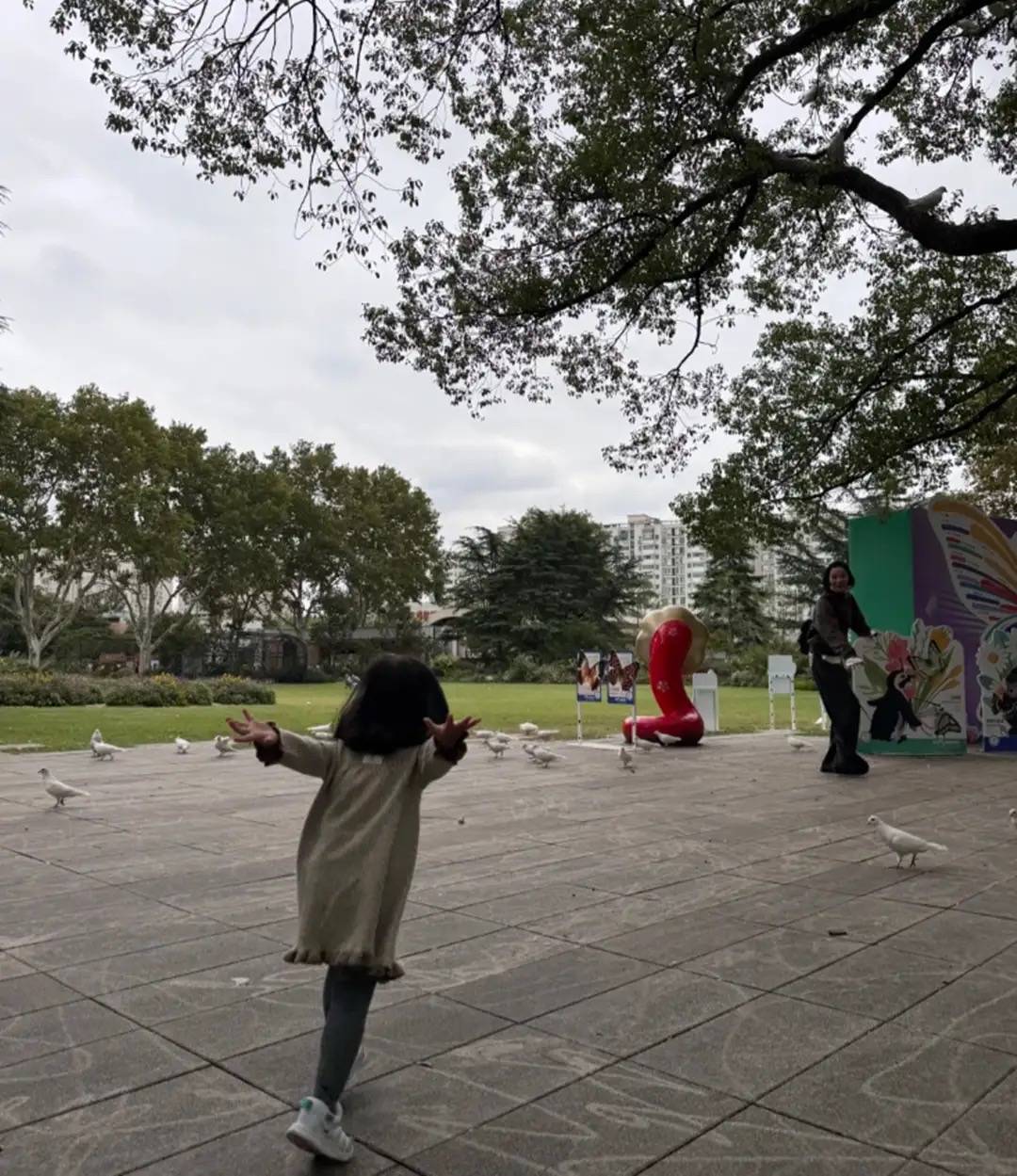 雎晓雯陪娃玩耍,老公也没闲着,除了给她们拍美照、也要参与到带娃的队伍中来。公园里有好多白色和平鸽,她们在这里嬉戏、追逐、打闹。
