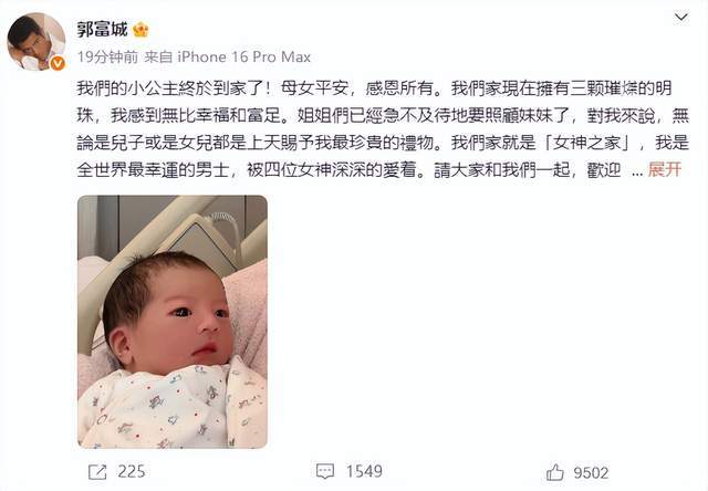 这次官宣三胎是女儿,郭富城也是再次强调了自己的态度:无论是儿子或是女儿都是上天赐予我最珍贵的礼物,我们家就好似“女神之家”。我是全世界最幸运的男士,被四位女神深深的爱着。