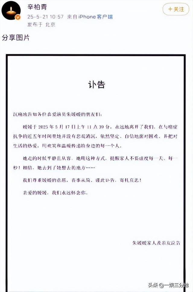 后来朱媛媛去世后,她的朋友透露,辛柏青把老婆生病的事瞒的死死的,所有人都是在他发讣告的时候才知道的。