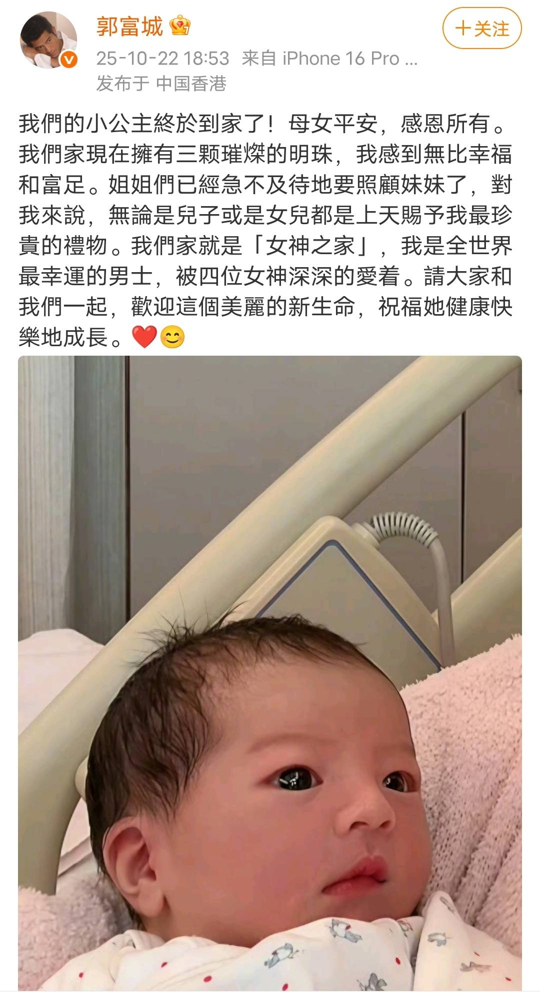 不久后,郭富城在个人社交平台正式官宣三胎喜讯,并公布了宝宝的性别——一位“小公主”。虽然之前传闻第三胎是男孩,但郭富城依然非常开心,迎来了又一位闺女。