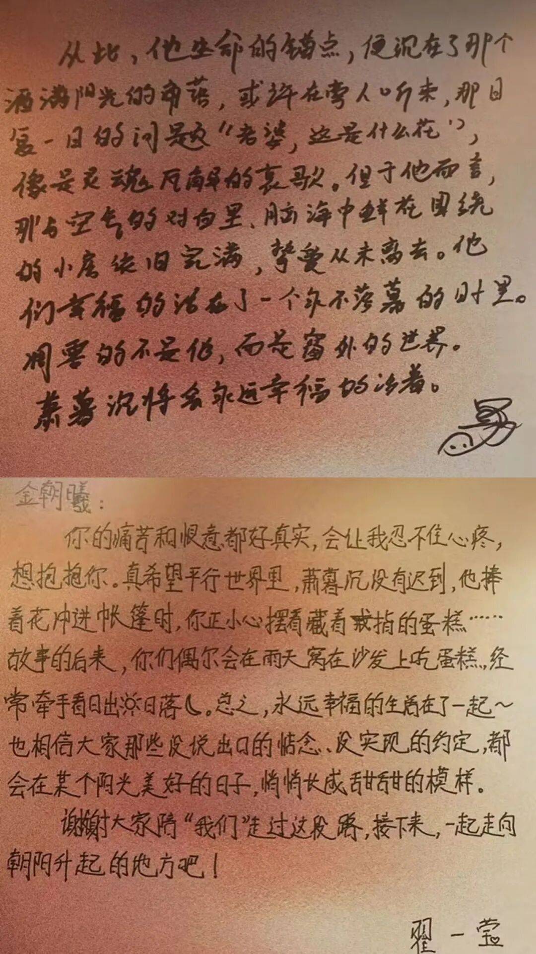 这种精心复仇、环环相扣的悬疑剧,看到最后确实有大仇得报的快感,可男主的结局也令人唏嘘不已。好在结尾处申浩男和翟一莹的手写信,给了观众一些安慰,同时也显示出了剧组的诚意。