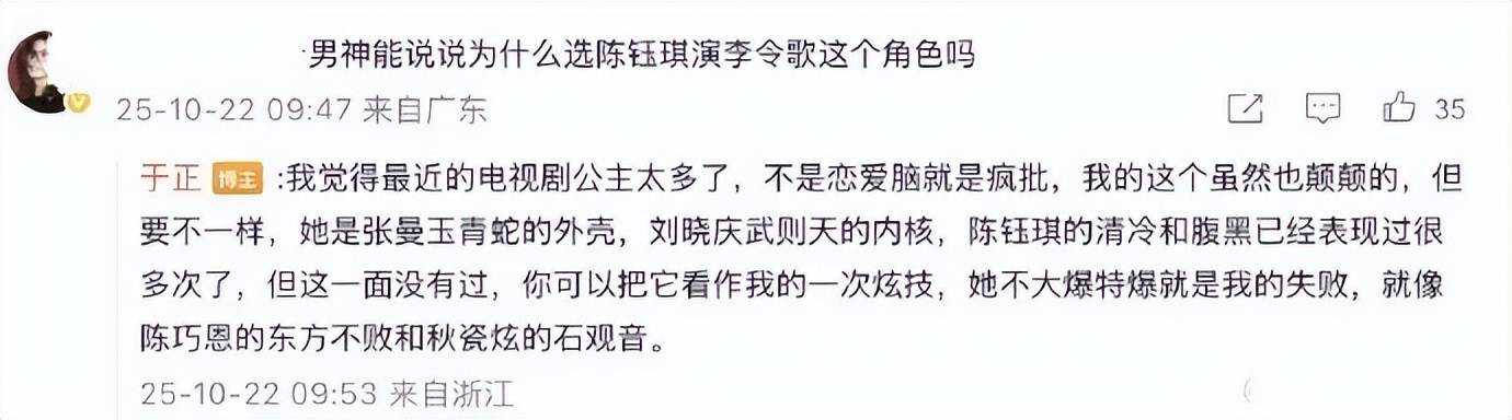 于正坦言:“我觉得最近电视剧公主太多了,不是恋爱脑,就是疯批,我的这个虽然也颠覆的,但要不一样,她是张曼玉青蛇的外壳,刘晓庆武则天的内核,陈钰琪的清冷和腹黑已经保险过很多次了,但这一面没有过,你可以把它看做我的一次炫技,她不大爆特爆就是我的失败,就像陈乔恩的东方不败和秋瓷炫的石观音!”