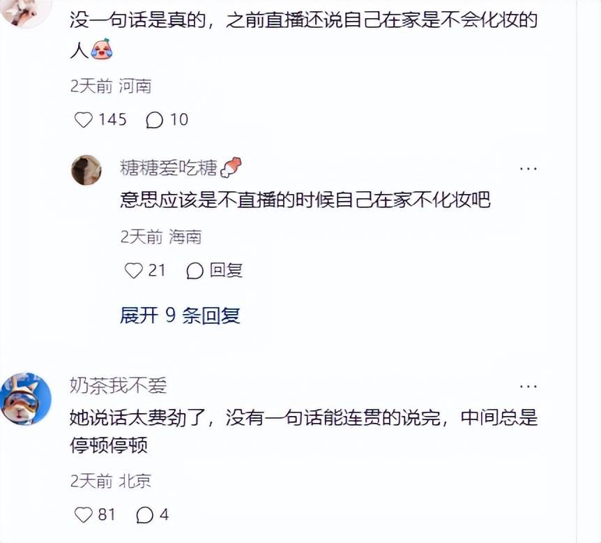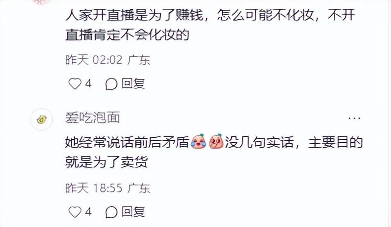 她这番直播却败了不少网友对她的好感,怒斥她是满嘴跑火车,仍记得她之前直播时,还说自己在家懒得梳妆打扮。
