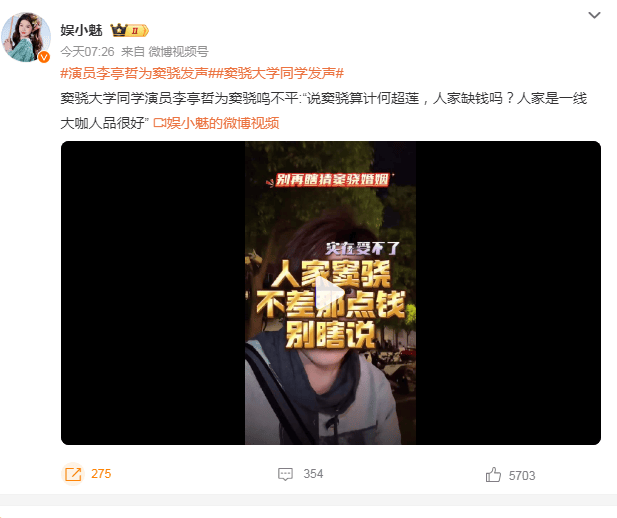 刚才,窦骁大学同学演员李亭哲为窦骁鸣不平:“说窦骁算计何超莲,人家缺钱吗?人家是一线大咖人品很好”