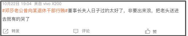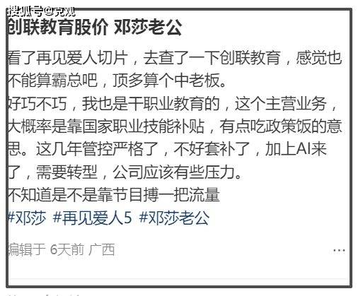 网友扒出路行公司市值2亿多的公司,去年赔了1亿多,今年预计亏损7000多万。猜测他或许是因为想圈钱才上综艺,情绪稳定也不是因为财富过人而是破产前的无奈。至于邓莎之所以说不知道路行的资产,则是知道对方的经济情况,担心离婚后被追债。