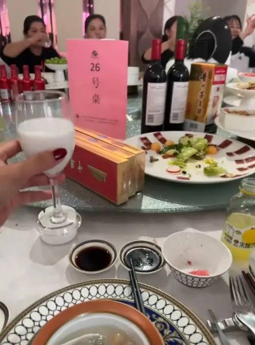 酒席的规格也很高档,宾客们喝的有红酒也有茅台,看着餐盘里还有海鲜、三文鱼、生鱼片之类的。