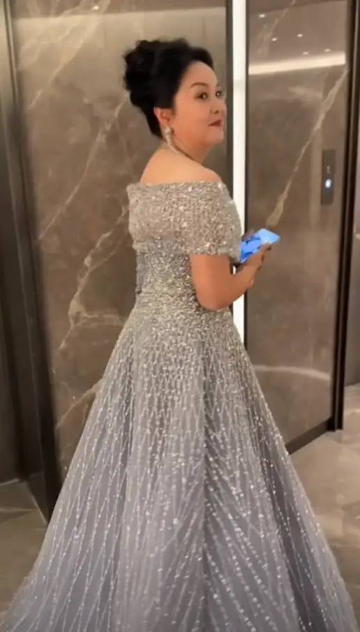 章若楠妈妈打扮的很华丽,穿着一字肩的礼服、全身都是亮闪闪的元素,还做了很贵妇的盘发。这样的打扮,给人一种很有钱的感觉,闪耀又贵气。