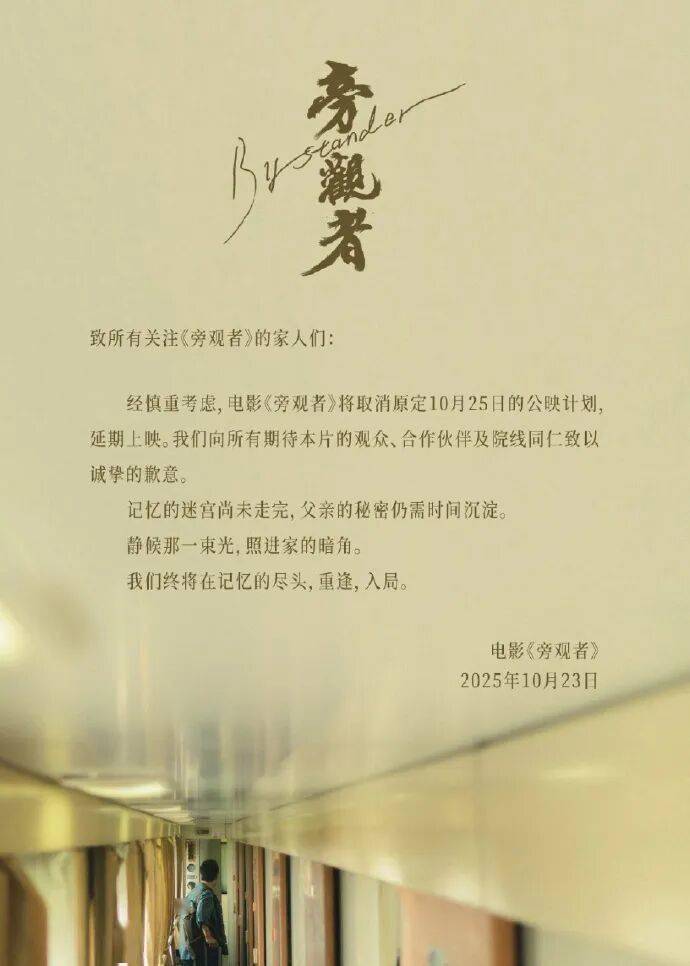 由陈坤、王砚辉、刘敏涛主演电影《旁观者》官宣撤档:“经慎重考虑,电影《旁观者》将取消原定10月25日的公映计划延期上映。”