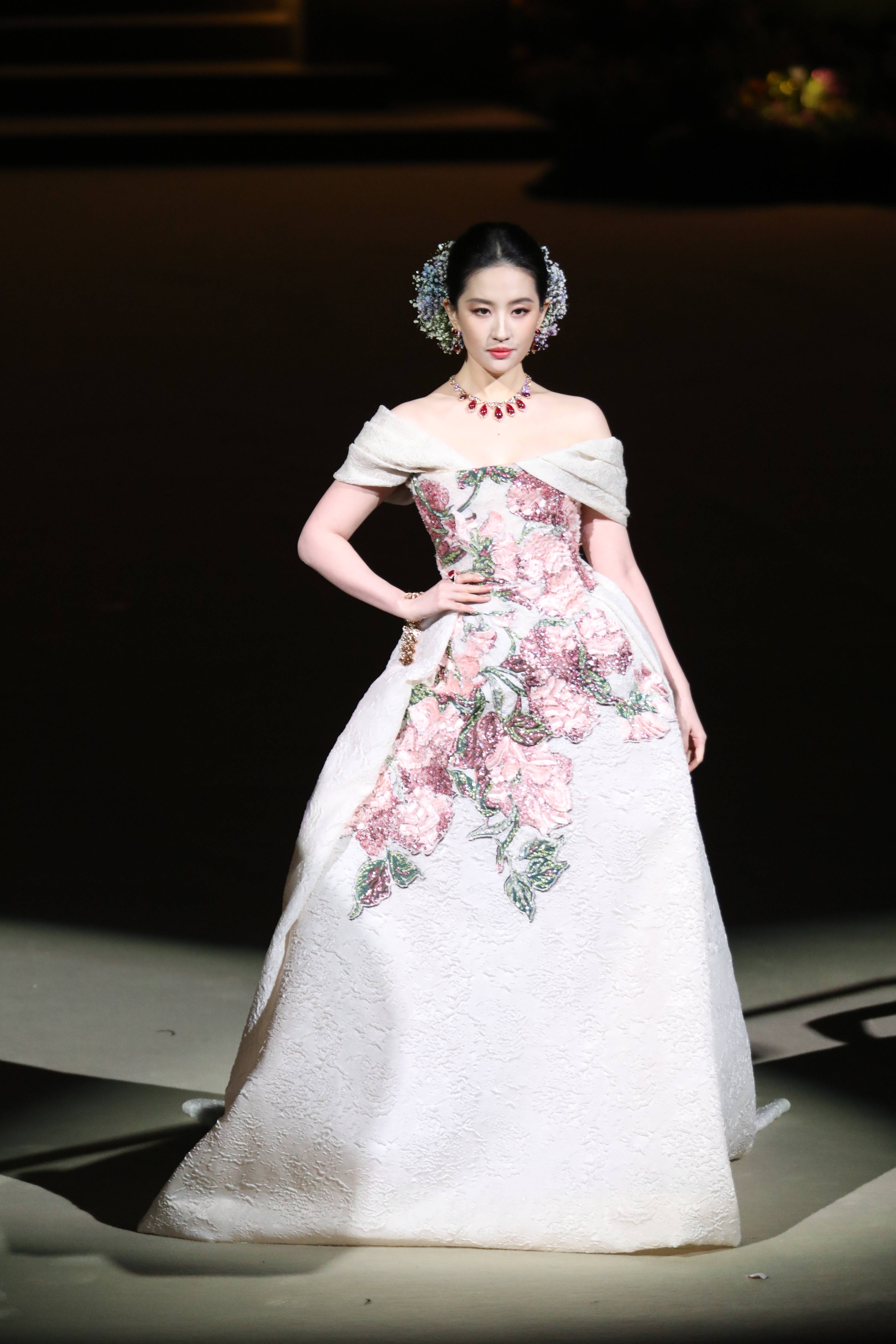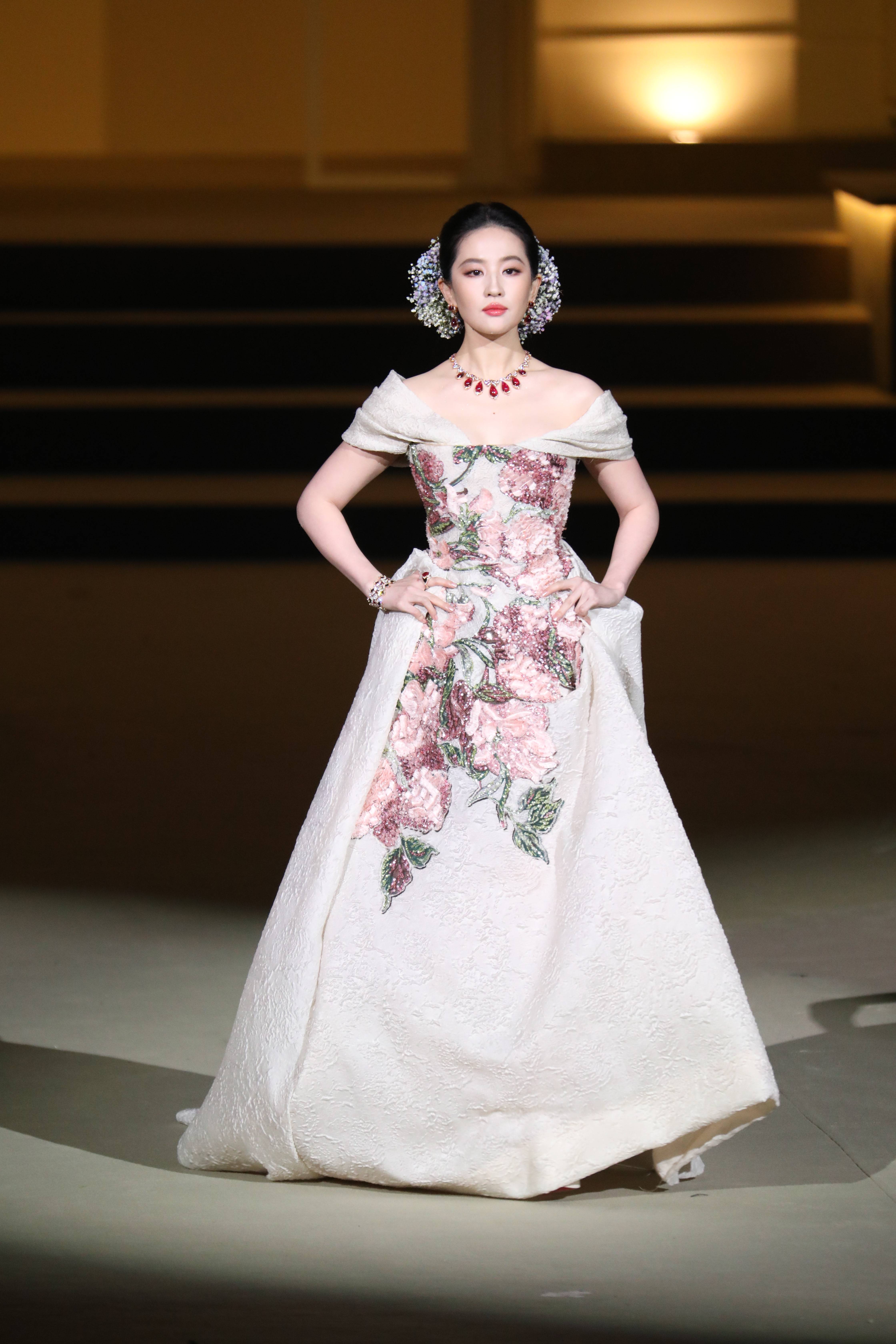 刘亦菲盘头簪着花朵,佩戴优雅红宝石项链,气质在线。