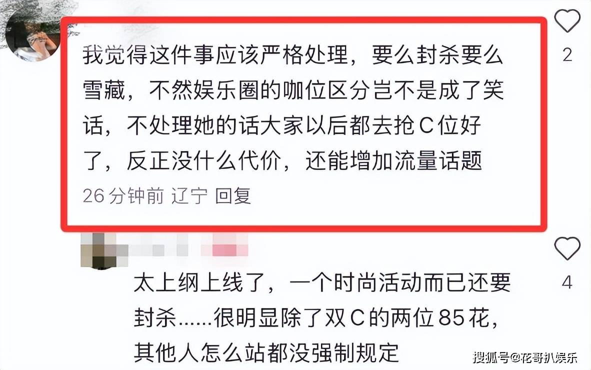 钟楚曦当时可能以为自己的小心思没有人会发觉,但没想到这事闹得特别大,网友送上外号“钟杵C”。社交评论区也被网友给冲了,嘲笑她为了抢C位不顾体面。还有网友觉得她这么做导致整场盛典都乱糟糟的,影响太恶劣了,建议时尚圈封杀她,免得被其他人效仿。