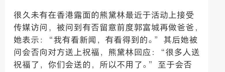 她现在看着像是一种不是特别幸福,又偏偏要挽尊的状态,这让不少网友想起了郭富城的前女友熊黛林,又跑到熊黛林的社交平台下,夸她才像是真正嫁给幸福的样子。