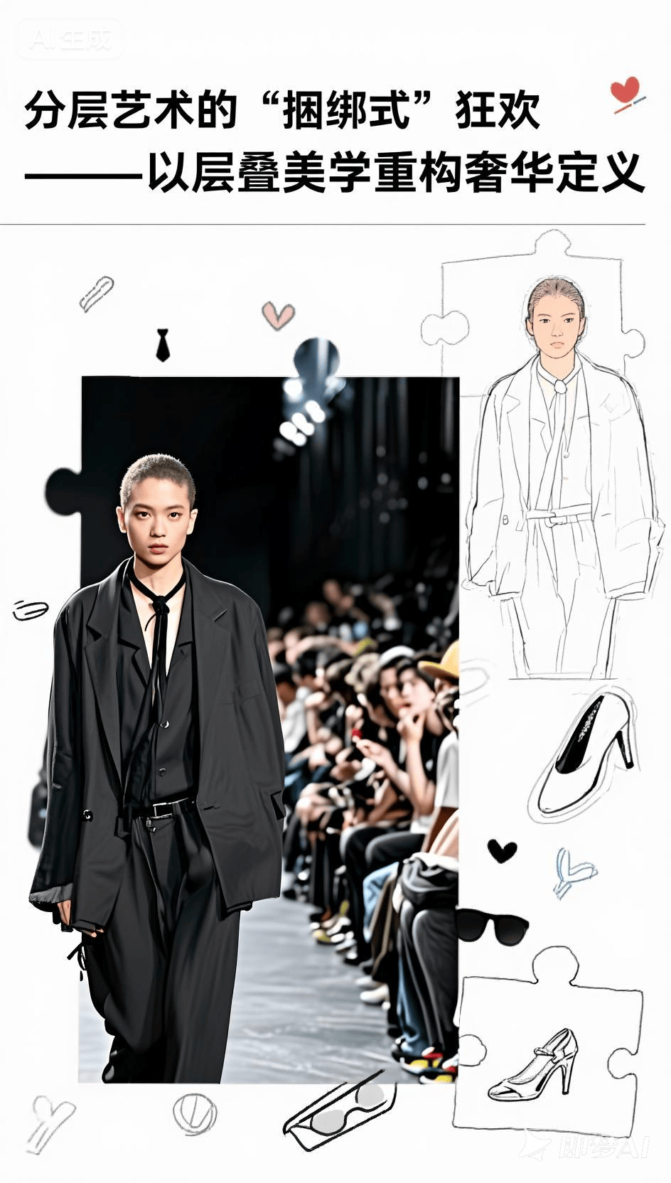 忘掉“少即是多”的教条吧,这一季的时尚真理是:更多,就是更多。但“多”并非杂乱无章,而是用材质碰撞(绸缎配粗花呢)、长短错落(长裙叠短裤)、松紧对比(宽松外套束紧腰带)的智慧,让每一层都成为独立的风格注脚,最终拼贴成一首立体的时尚诗篇。