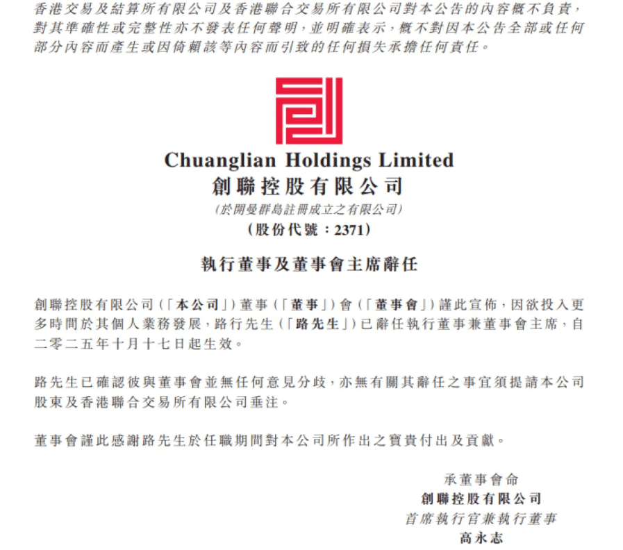 10月17日,创联控股发布公告称,路行因欲投入更多时间于其个人业务发展,已辞任创联控股有限公司执行董事兼董事会主席,辞任自2025年10月17日起生效。